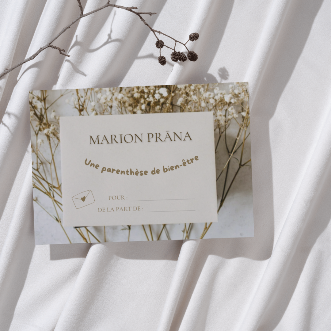 Offrir un bon cadeau Marion Prāna, c’est bien plus qu’un cadeau : c’est une invitation à vivre un moment de bien-être complet. Chaque soin est conçu pour apaiser le corps et l’esprit.